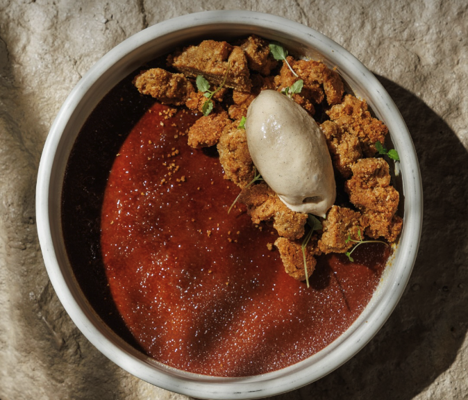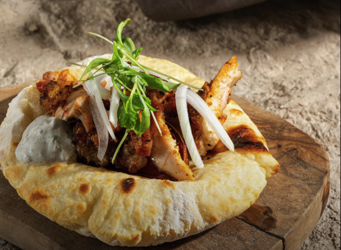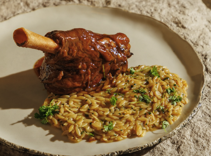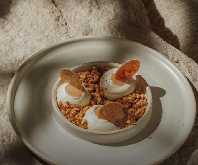 Welcome to a light-filled world of flavours and sensations split over two levels. By day, guests arrive at a ground floor space illuminated in yellows and light-browns, hanging barley nodding to age-old agricultural practices that gave Greece the gift of its cuisine. Walls and ceiling charred by the fires of inspiration, a staircase sculpted around a 25-foot olive tree climbs to our upper restaurant. There, natural creams, tans, and a double-height cliff face represent the firebird’s legendary rise and rebirth.