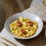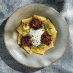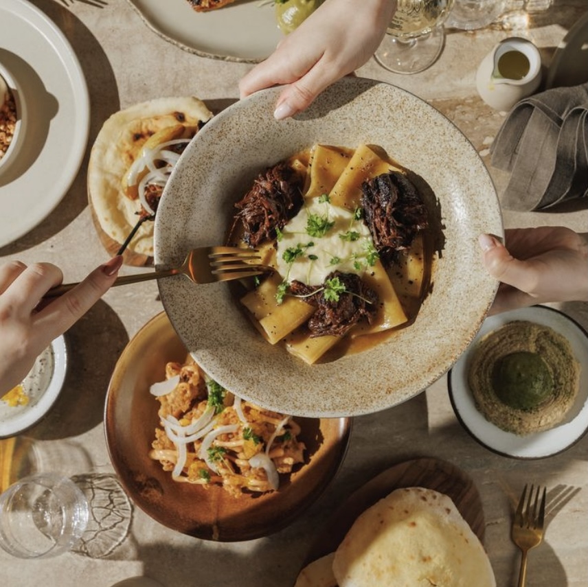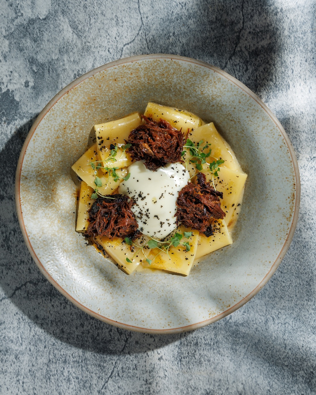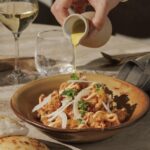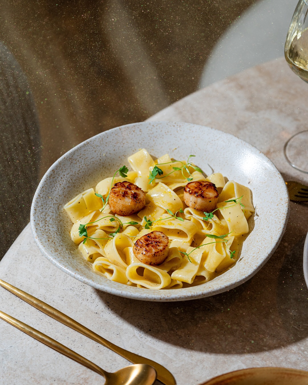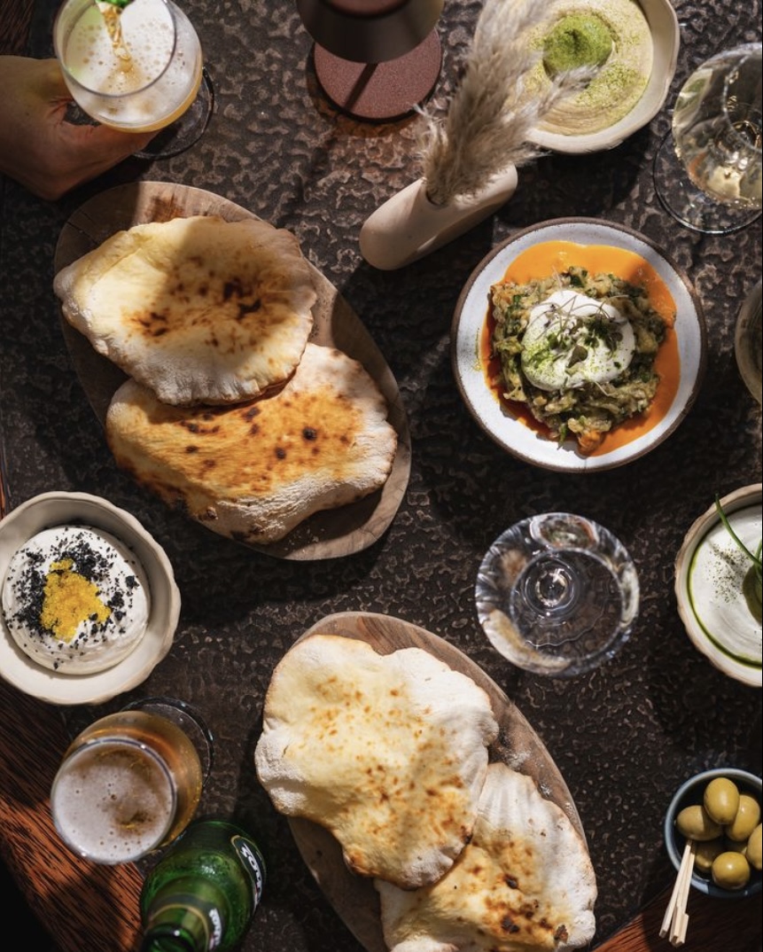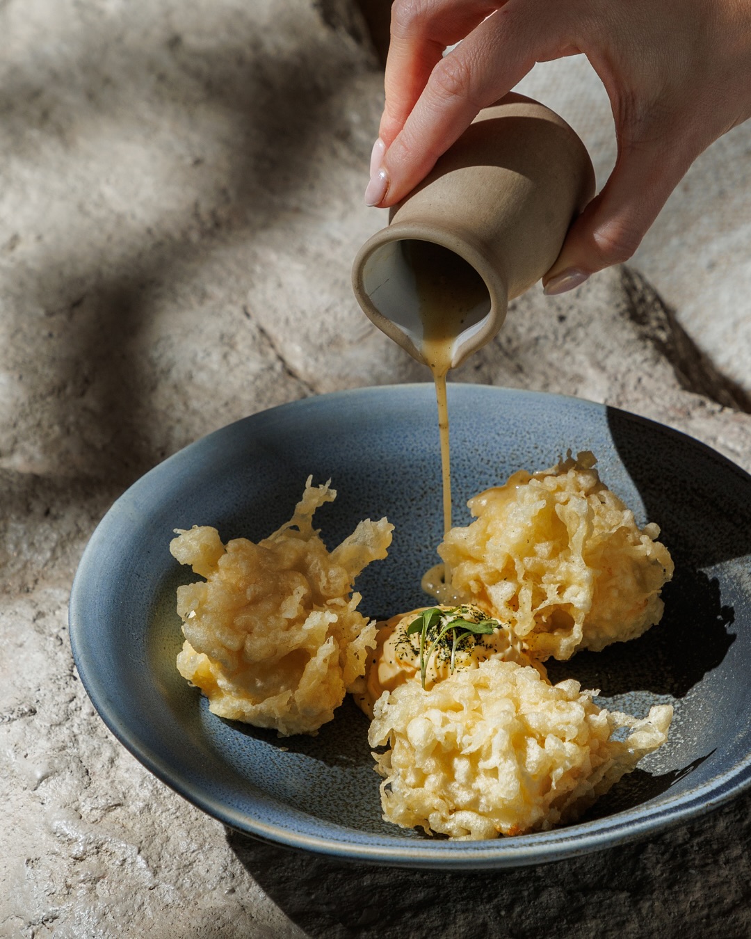 Welcome to a light-filled world of flavours and sensations split over two levels. By day, guests arrive at a ground floor space illuminated in yellows and light-browns, hanging barley nodding to age-old agricultural practices that gave Greece the gift of its cuisine. Walls and ceiling charred by the fires of inspiration, a staircase sculpted around a 25-foot olive tree climbs to our upper restaurant. There, natural creams, tans, and a double-height cliff face represent the firebird’s legendary rise and rebirth.