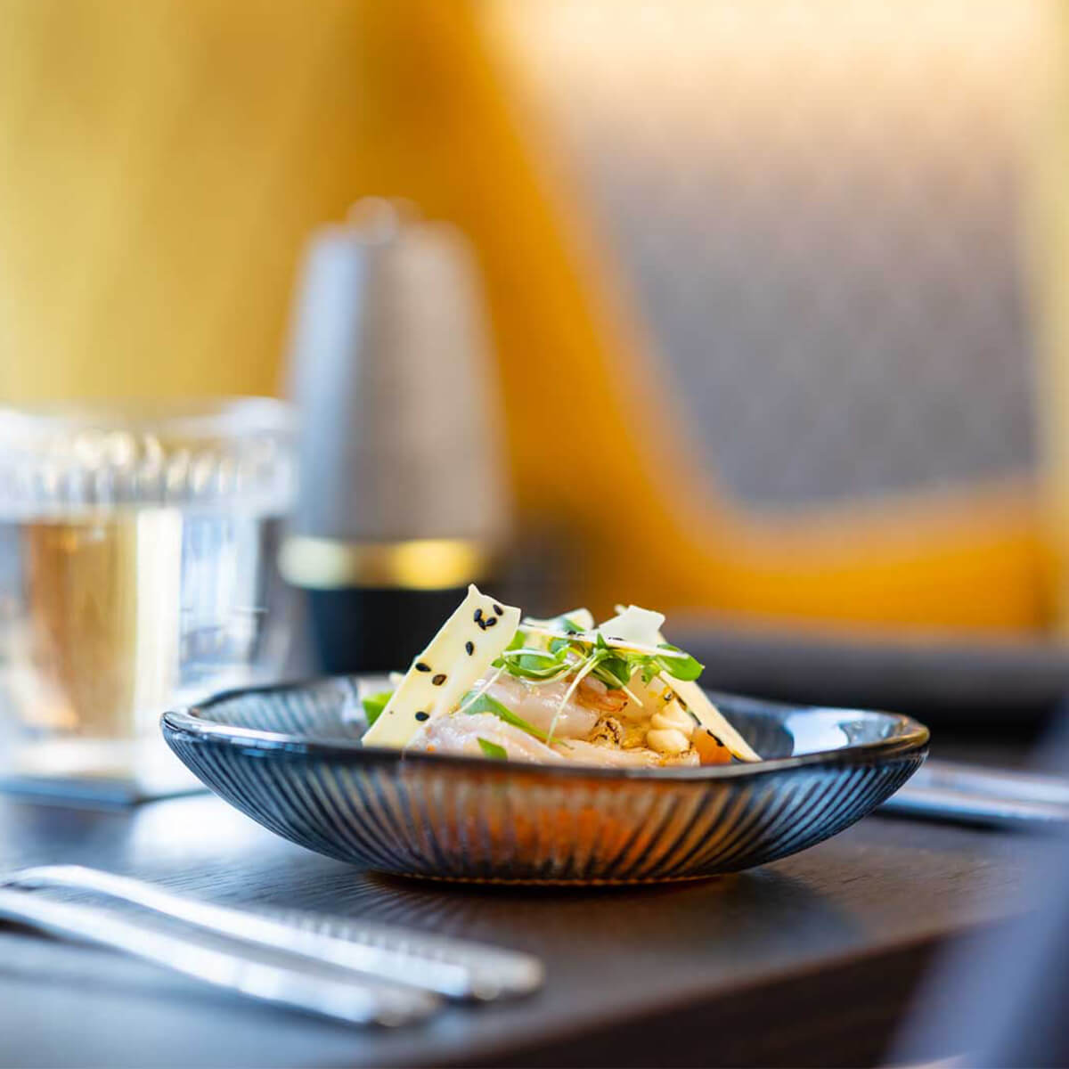 The dining room situated on the upper-level hosts 40 diners, while the private dining room on the lower level is a suitably intimate environment for groups of up to 10, with a bijou outdoor drinks terrace overlooking the banks of the flowing river.